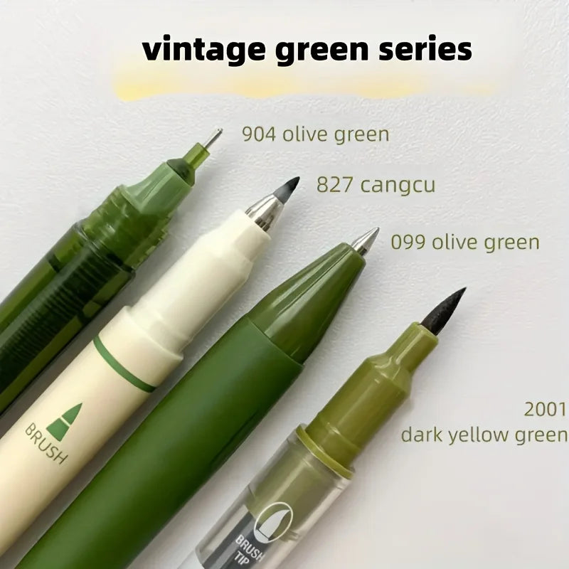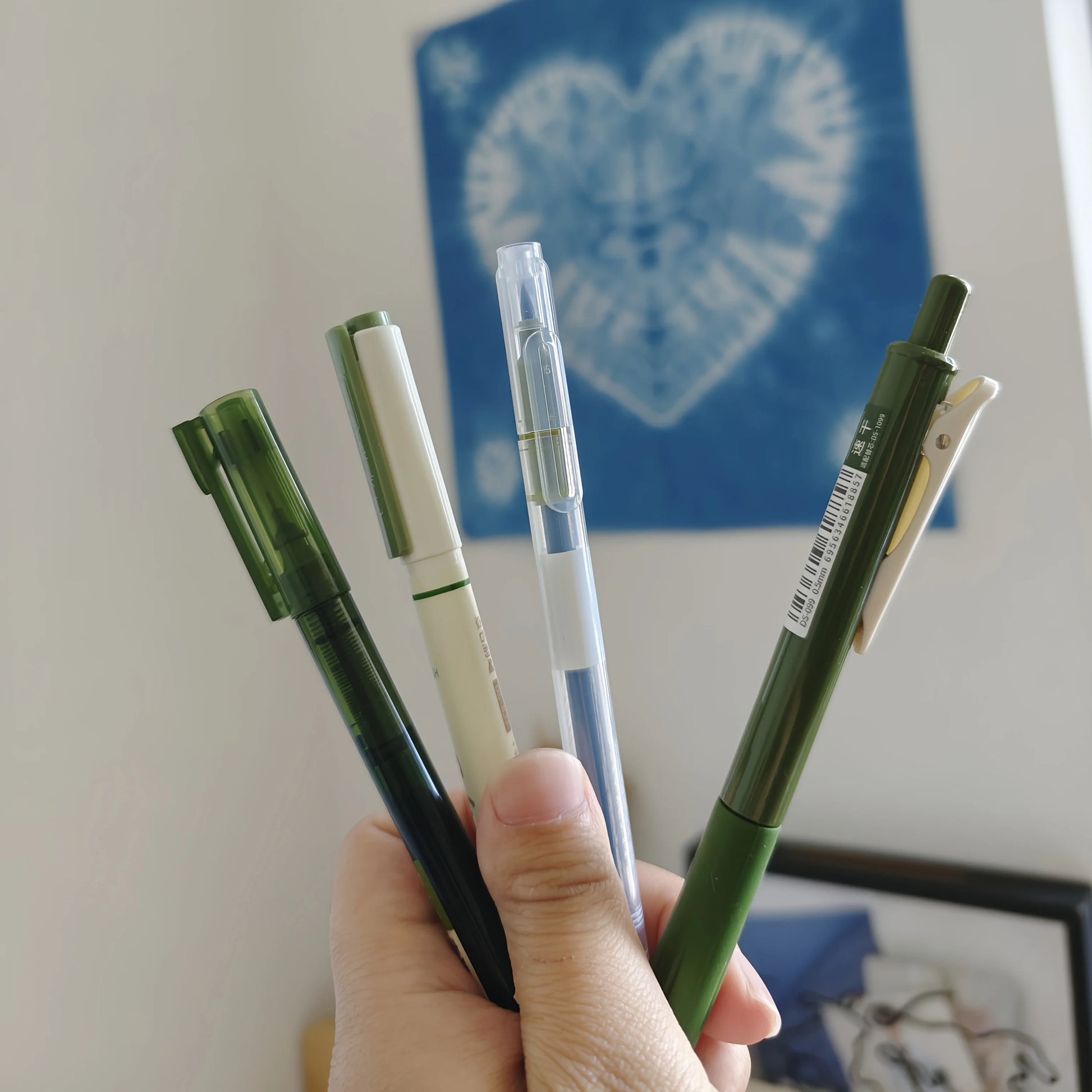 - Contenido: Set de bolígrafos y marcadores en gama de verdes y crema.
