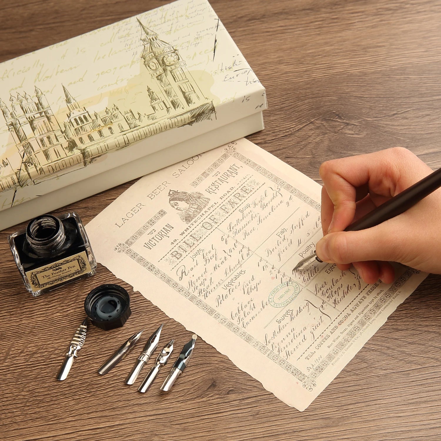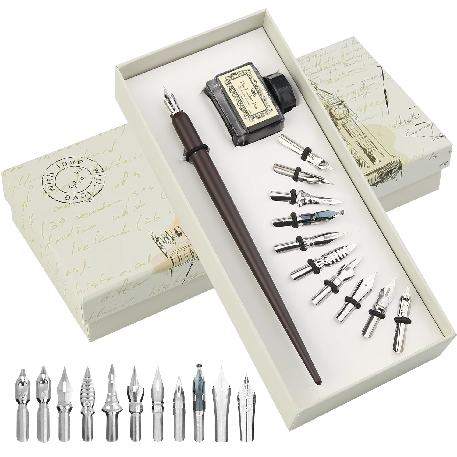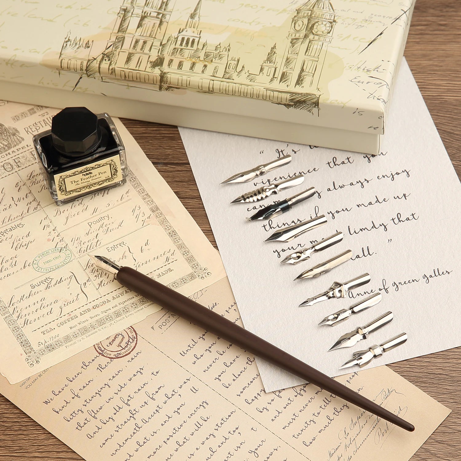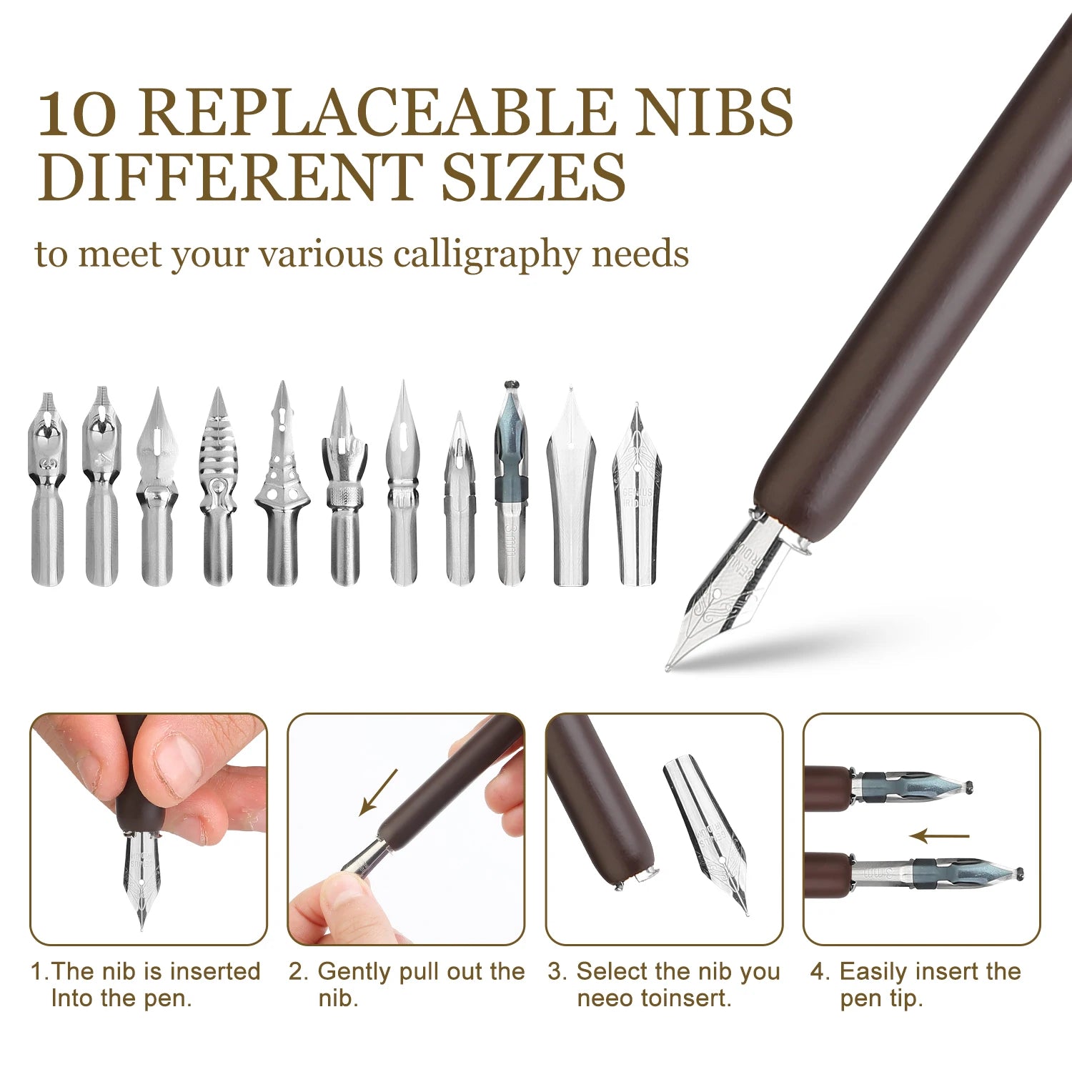 - 10 Plumillas Intercambiables: Incluye una variedad de puntas de diferentes grosores y formas para adaptarse a todos los estilos de caligrafía, desde la fina letra inglesa hasta trazos anchos y góticos.