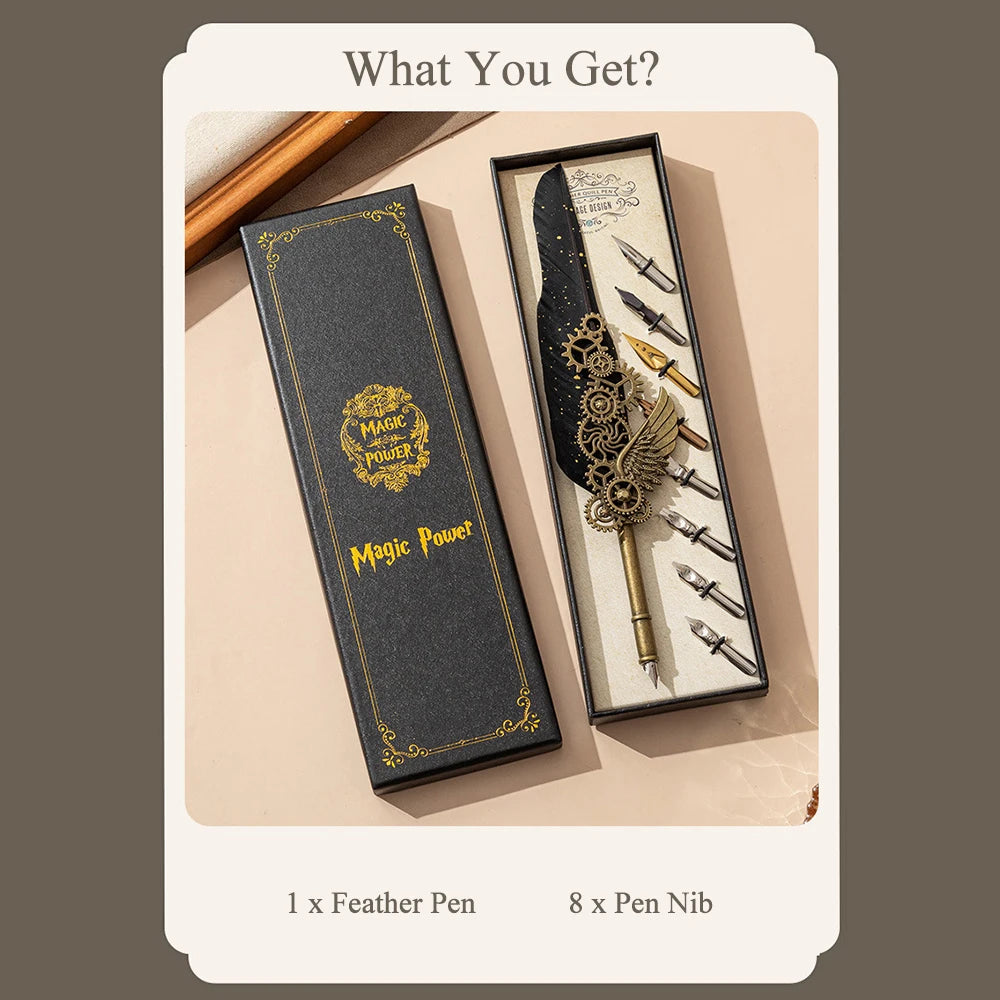 - Diseño Exclusivo: Pluma negra de alta calidad decorada con engranajes dorados y detalles de ala metálica.