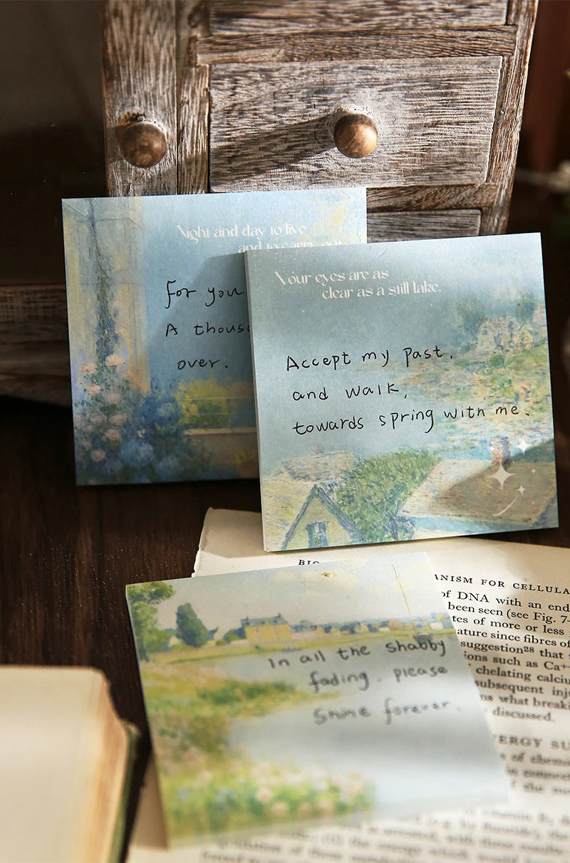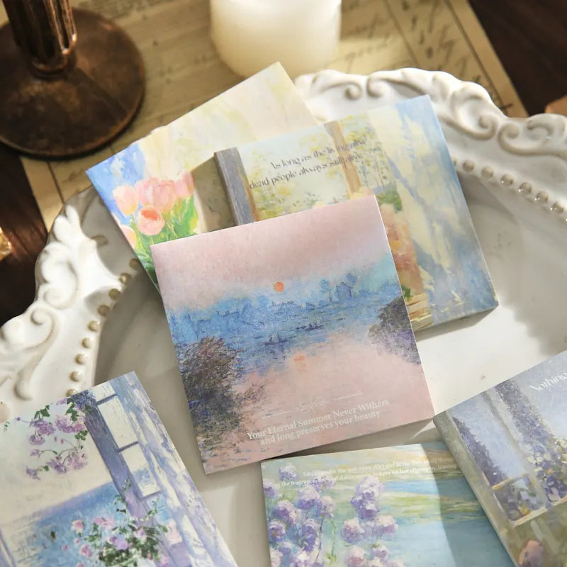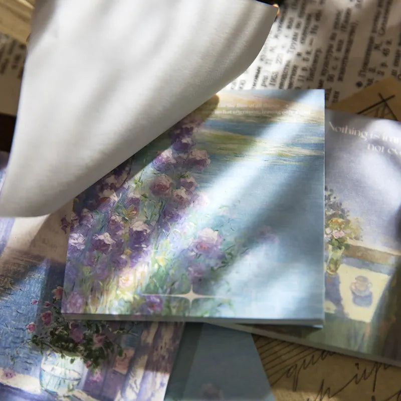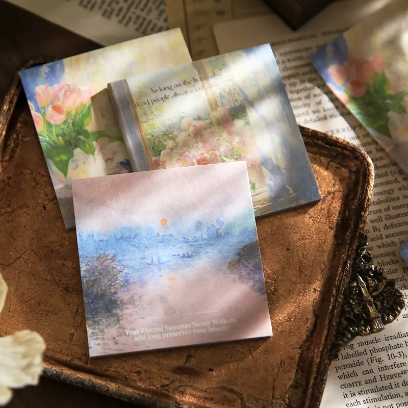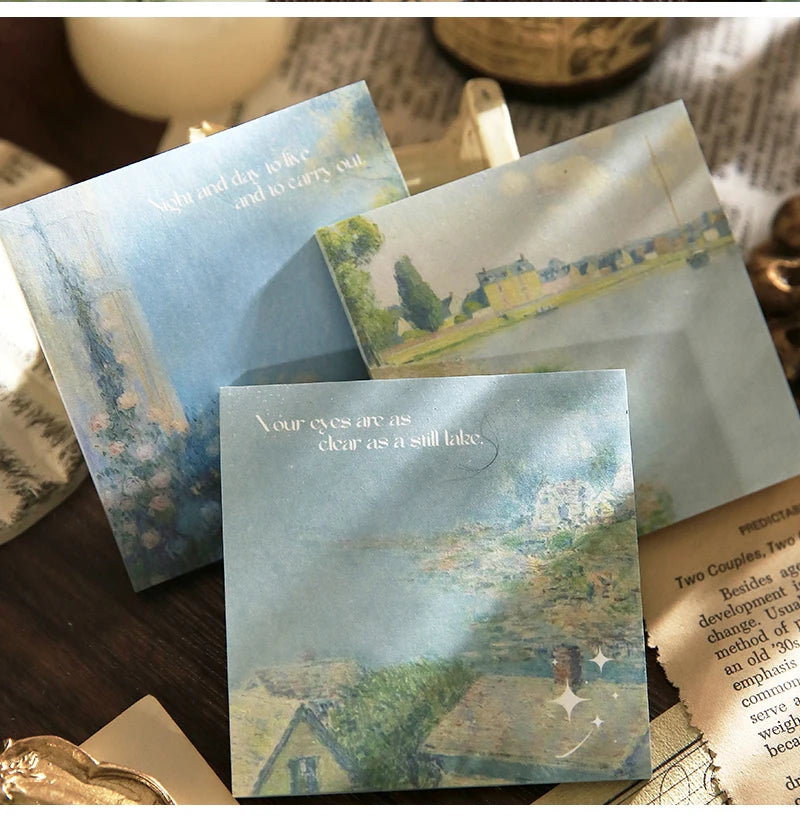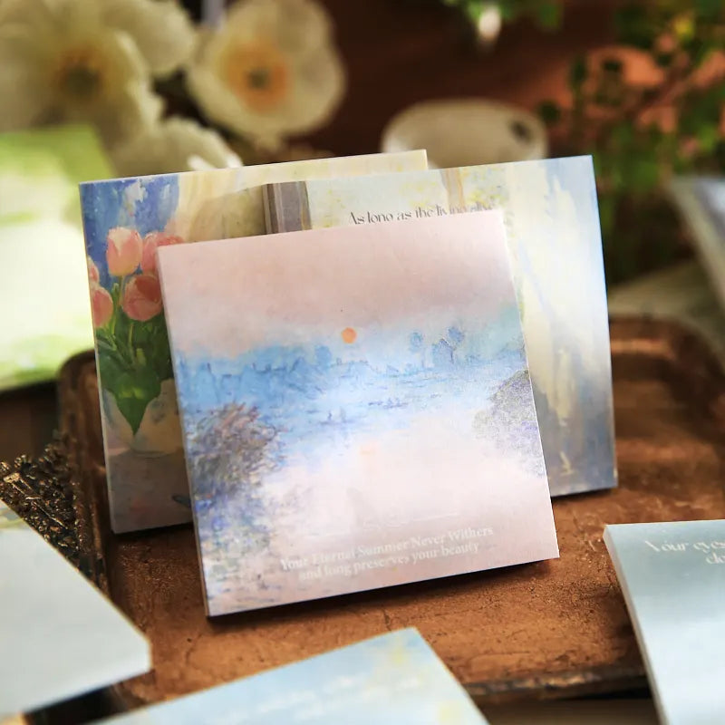 ¿Por qué conformarte con un papel liso cuando puedes capturar tus ideas sobre un amanecer impresionista? Nuestra colección Galería del Pensamiento transforma cada uno de tus recordatorios en una pequeña pieza de arte. Con ilustraciones inspiradas en jardines clásicos y paisajes llenos de luz, estas notas son el complemento ideal para quienes buscan que su escritorio respire serenidad y elegancia.